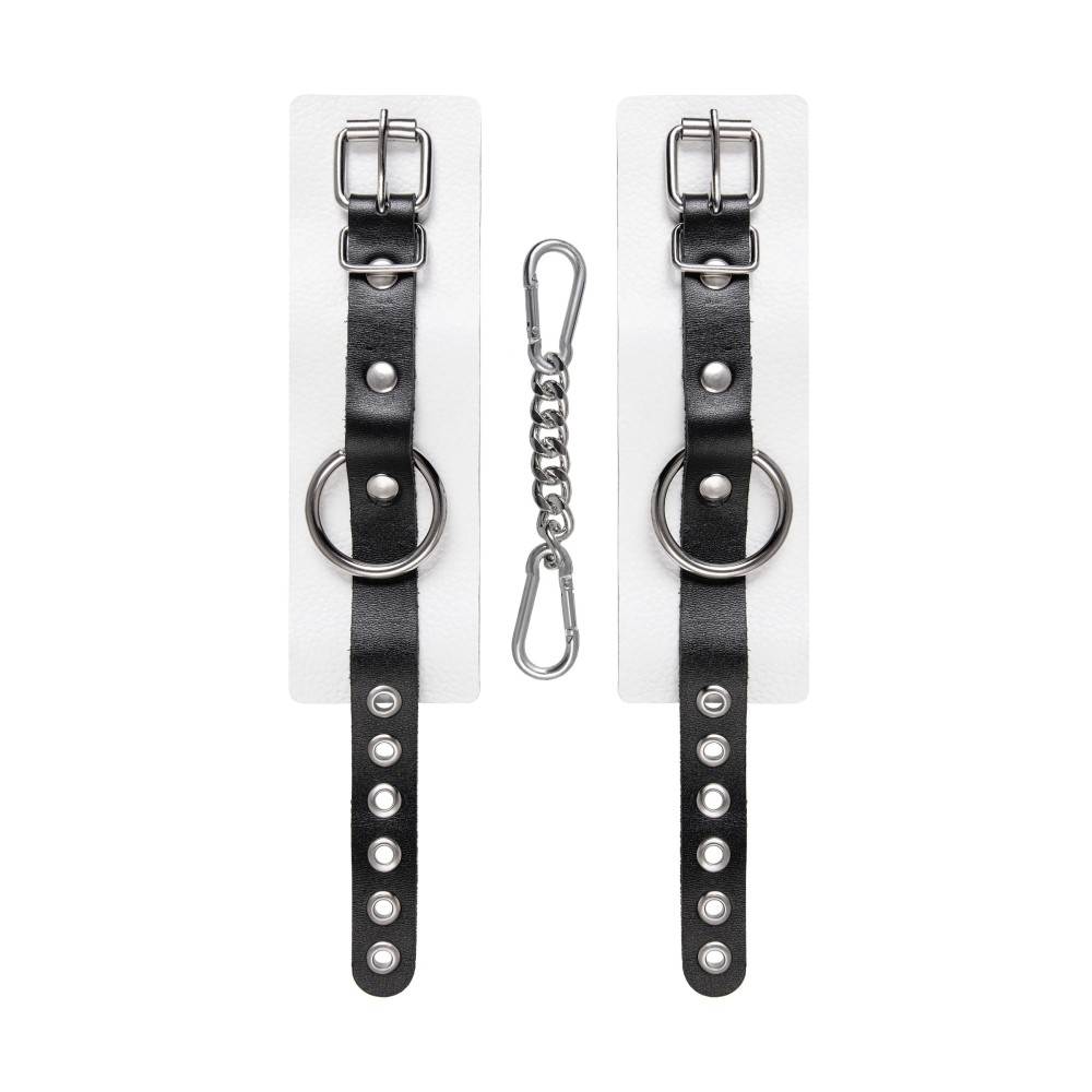 Готовы играть по-взрослому? Не бойтесь своих желаний! Основатели бренда уверены: лучший способ избавиться от искушения - поддаться ему! Добавьте пикантную деталь в ролевую игру и воплотите самую смелую сексуальную фантазию в реальность! Эти мягкие, белые, кожаные наручники с люверсами на жёстких, чёрных ремешках могут стать стильным аксессуаром, а могут послужить вашим целям по своему прямому назначению. Частичное обездвиживание и невозможность двигать руками дают вам полную власть над партнером – взрослые игры для взрослых. Наличие двух колец и карабинов, соединенных между собой металлической цепочкой, позволяет использовать изделие как раздельно – аксессуар-манжеты, так и как наручники для фиксации. К широким металлическим кольцам также можно присоединить и другие аксессуары при помощи карабинов. Благодаря универсальному размеру наручники могут использоваться и мужчинами, и женщинами. Размер легко регулируется с помощью металлических пряжек, органично вписывающихся в общий стиль. Длина манжет - 18 см, ширина - 5,5 см. Длина сцепки - 20 см.