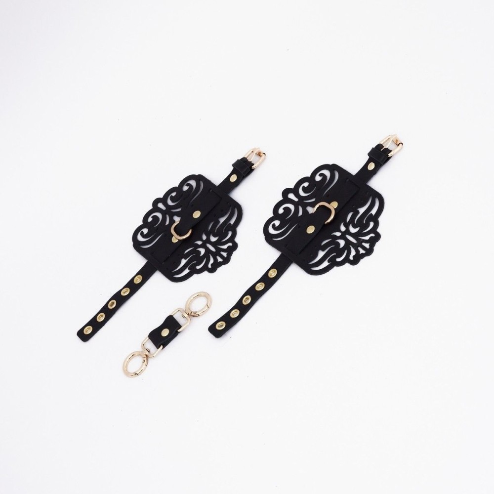 Наручники фигурные из натуральной кожи, украшенные узорами. Каждый элемент дизайна тщательно проработан, чтобы подчеркнуть красоту и элегантность изделия. Золотая фурнитура, сверкающая на фоне черной кожи, добавляет утонченности и изысканности. Полукольцо, расположенное посередине, предоставляет дополнительные возможности для фиксации рук с помощью соединительного элемента с двумя карабинами, который идет в комплекте. Доставляется в фирменной упаковке в виде брендированной деревянной подложки.
