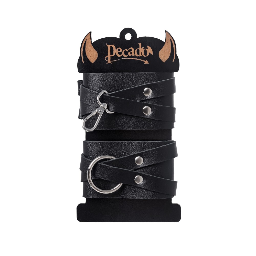 Черные оковы с оригинальным дизайном от российского производителя Pecado созданы для Вашего наслаждения. Они отлично смотрятся как на женских, так и на мужских ногах. Каждая деталь оков сделана с огромным трепетом и вручную. Аксессуар приятно держать в руках, а также использовать по назначению. Натуральная, экологичная кожа с терпкий ароматом обладает хорошей износостойкостью. Материал плотный, прекрасно держит форму и не мнется. Благодаря хорошей ширине манжет и металлической застежке, оковы отлично фиксируют ноги. Вся фурнитура высокого качества. На ремешках имеется хороший запас регулировки, что позволяет подобрать необходимый размер. Обе манжеты обладают разным дизайном. Главное отличие от других изделий в металлических деталях: на одном наручнике большое кольцо, на другом – карабин. При желании атрибут возможно дополнить другими аксессуарами. Длина манжет – 25,5 см, ширина – 6 см. Длина сцепки – 7,5 см.
