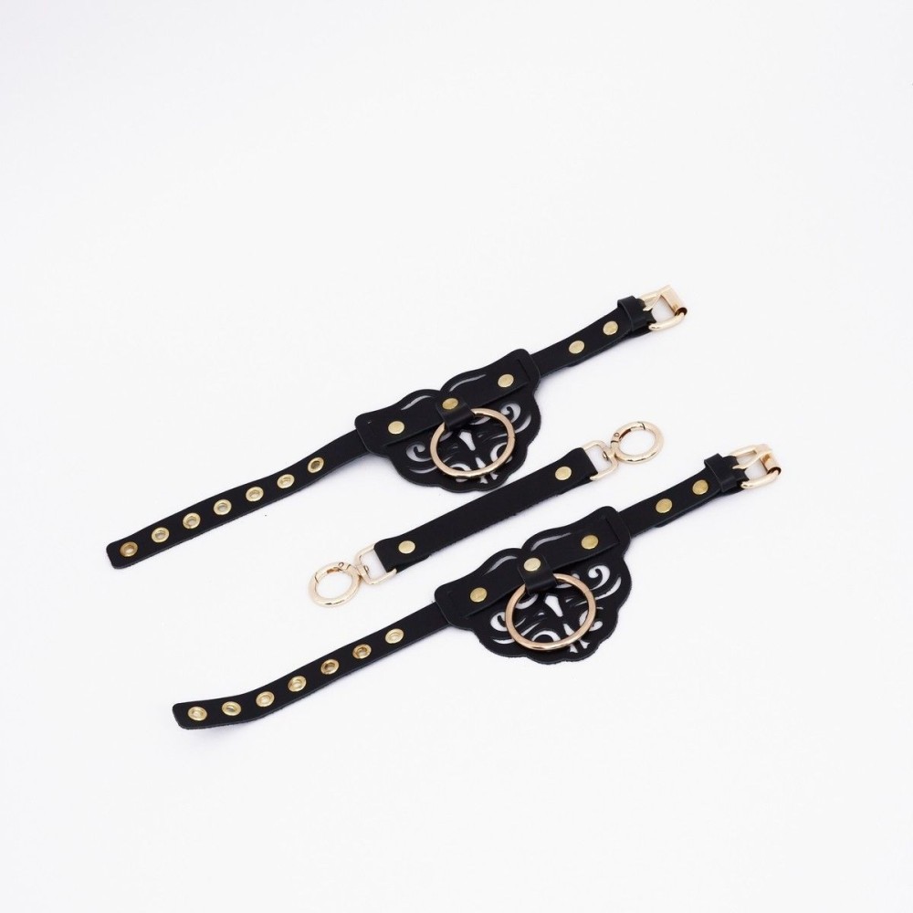 Оковы с декоративными резными узорами изготовлены из натуральной кожи. Декорированы золотой фурнитурой и клепками. В комплект также входит соединительный кожаный элемент с двумя карабинами, с помощью которого можно зафик...