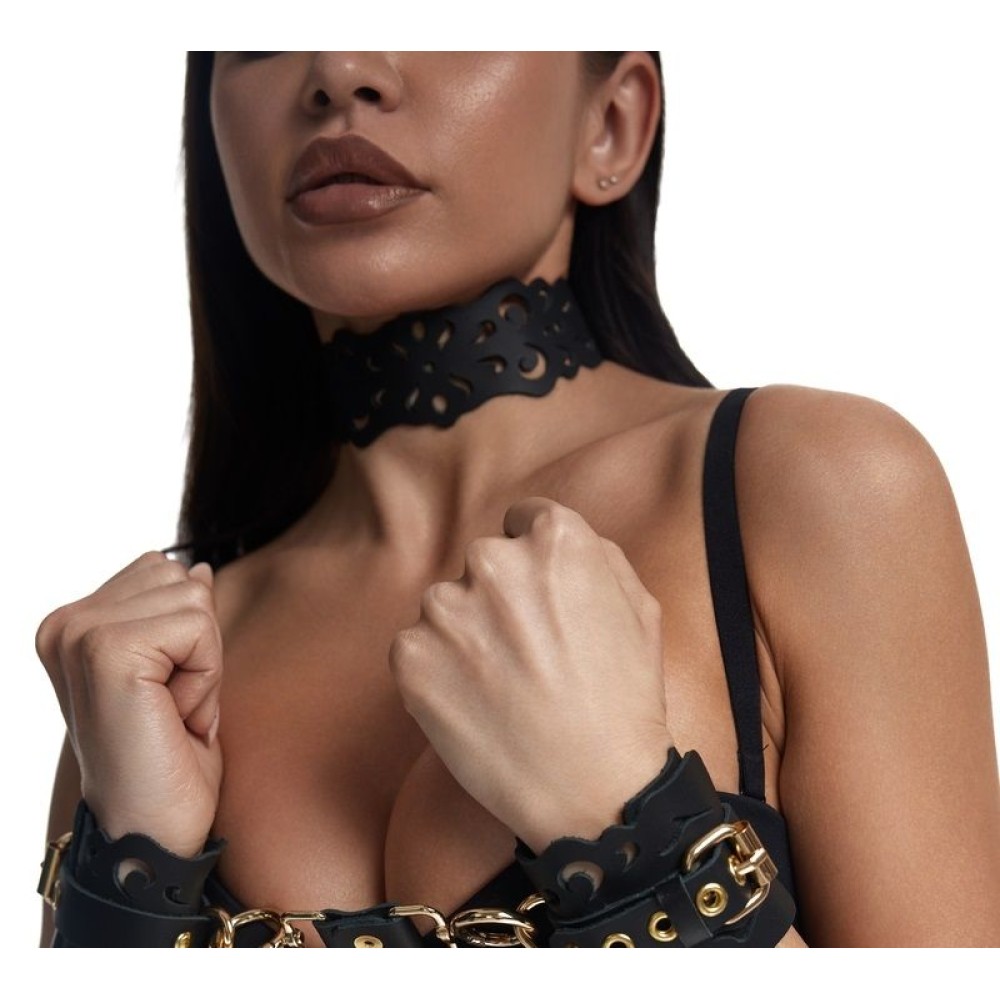 Чокер с узорным дизайном из натуральной кожи с золотой фурнитурой. Резные элементы придают атмосферу нежности, элегантности и подчеркивают красоту тела. Регулируется ремешком, поэтому прекрасно будет смотреться на любой шее. Доставляется в фирменной упаковке в виде брендированной деревянной подложки. Ширина основы - 5 см. Обхват - 32-40 см.