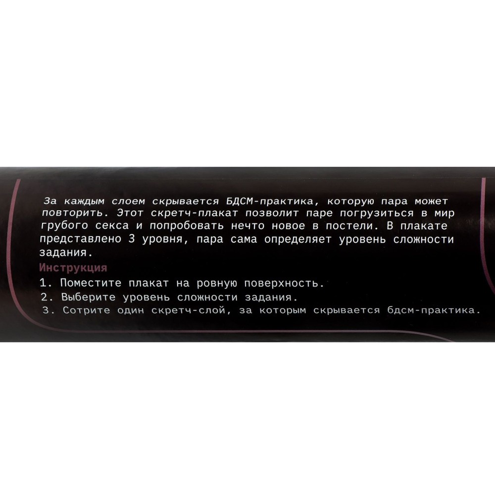 Плакат «BDSM» — это яркий и провокационный элемент для пар, желающих разнообразить свою интимную жизнь. Выполненный в формате A3 плакат предлагает уникальное сочетание искусства и игры, приглашая вас исследовать мир БДСМ и новые грани вашего взаимодействия. Он содержит множество идей и советов для безопасного и увлекательного погружения в мир ролевых игр, способствуя укреплению доверия и близости между партнерами. Позвольте своим сексуальным фантазиям стать реальностью с плакатом «BDSM»! В комплекте: плакат формата А3, тубус с инструкцией.