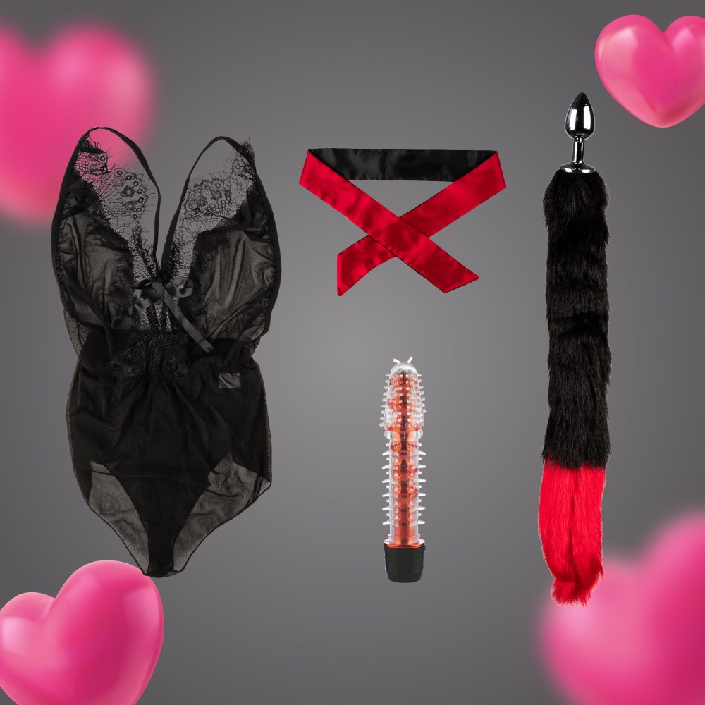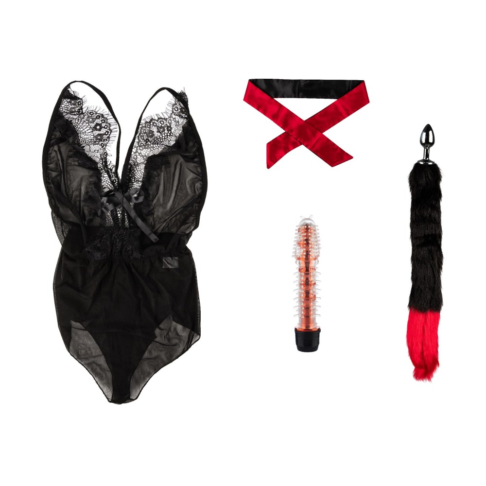 Набор состоит из нижнего белья (боди размера S-M), сатиновой повязки на глаза, металлической анальной пробки с хвостом из искусственной шерсти и силиконового вибратора с шипами. Возбуждающее нижнее белье наряду с секс-иг...