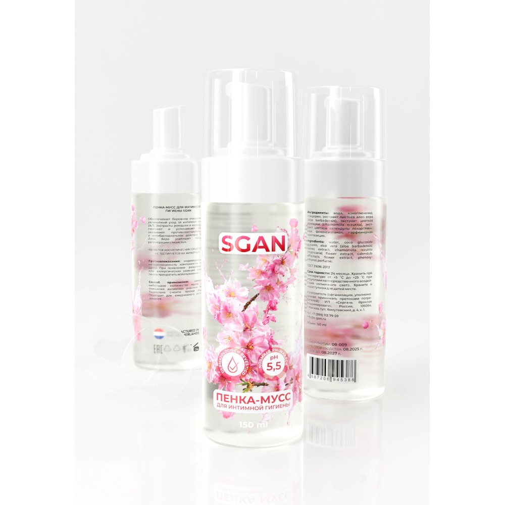 Пенка-мусс для интимной гигиены SGAN с пребиотическим эффектом. Ультрамягкая формула с pH 3.8–4.5 для чувствительной кожи интимных зон. Био-пенка подходит для ежедневного ухода, защитит естественную микрофлору. С успокаи...