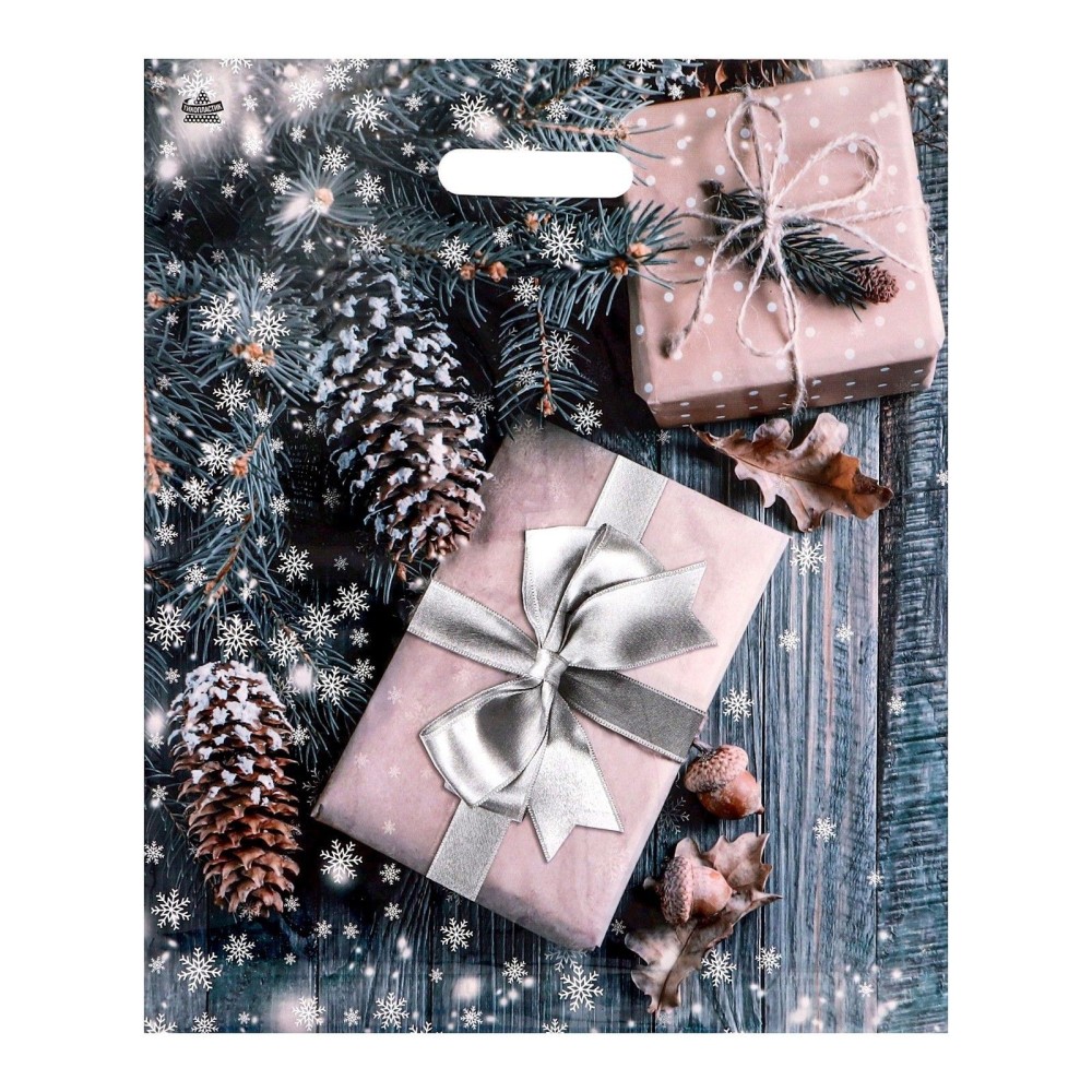 Новогодний пакет с принтом в виде подарков и вырубной ручкой (45х38 см)