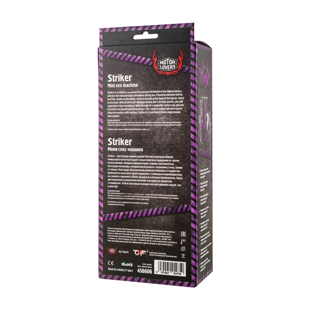 Striker - настоящая машина любви! Мягкий и нежный силикон наивысшего качества подарит самые приятные ощущения во время использования. Мощная вибрация будет хорошо чувствоваться, благодаря моторчику, который расположен в основании ствола, ближе к головке. Благодаря 10 различным режимам вибраций и 3 скоростям фрикций вы испытаете яркие ощущения. Частота фрикций 700-900 фрикций в минуту. С помощью мощной присоски, вы сможете закрепить Striker на ровных и плоских поверхностях. Пульт дистанционного управления позволит насладиться процессом с комфортом на расстоянии до 5 метров. Striker настоящая находка как для одиноких людей, так и для пар! Рабочая длина - 11,5 см.