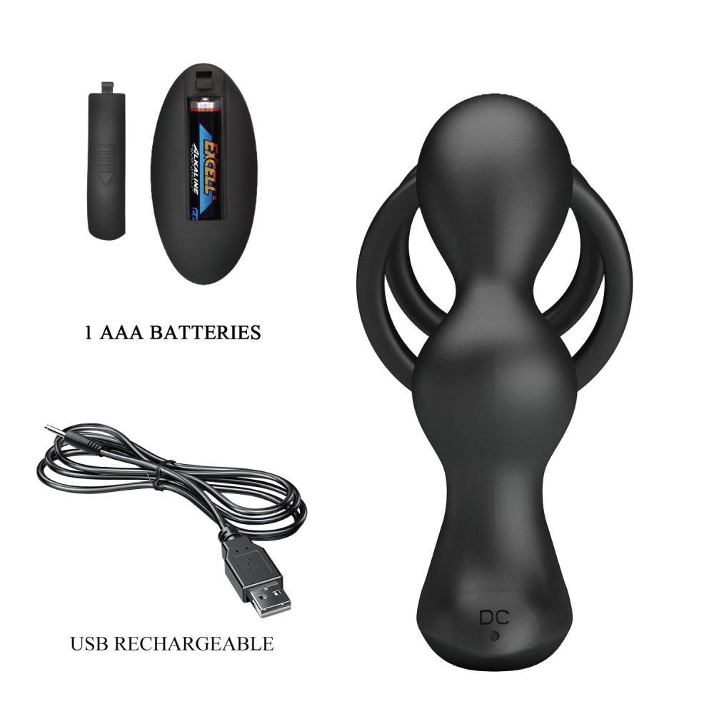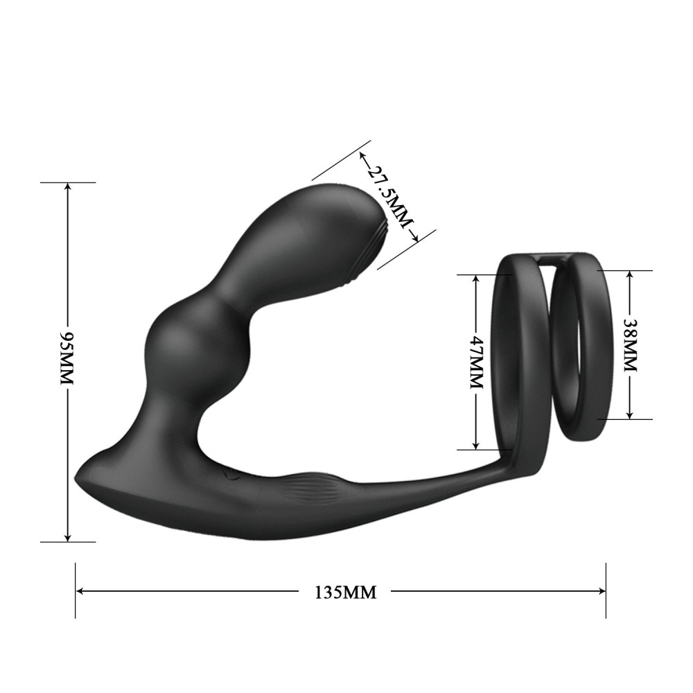 Кольцо с анальным вибростимулятором для двойного удовольствия. Плотно обхватывает пенис и яички, усиливая эрекцию, а пробка с 12 режимами вибрации дарит дополнительную стимуляцию. Пульт управления позволяет менять режимы без рук. Рабочая длина - 7,5 см. Диаметр колец - 3,8 и 4,7 см.