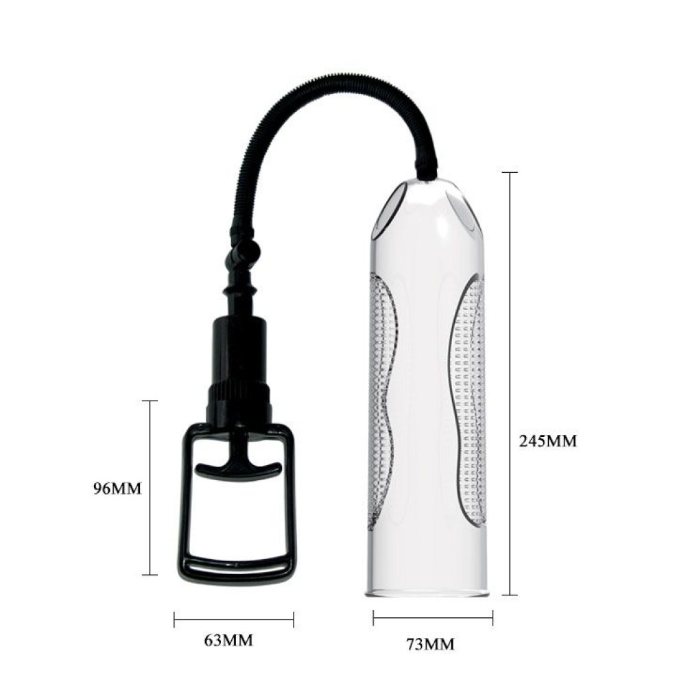 Вакуумная помпа с вибрацией, выполненная из прозрачного материала с уплотненной манжетой черного цвета, которая плотно обхватывает половой член, создавая полную герметичность. Воздух откачивается при помощи вакуумного шланга удобным механизмом откачки. Давление в колбе сбрасывается при помощи кнопки, расположенной на верхней части самой колбы. Механизм вибрации крепится к помпе с помощью эластичного материала с кармашком для виброяичка, которое управляется выносным пультом. Длина колбы - 24,5 см, диаметр - 7,3 см.