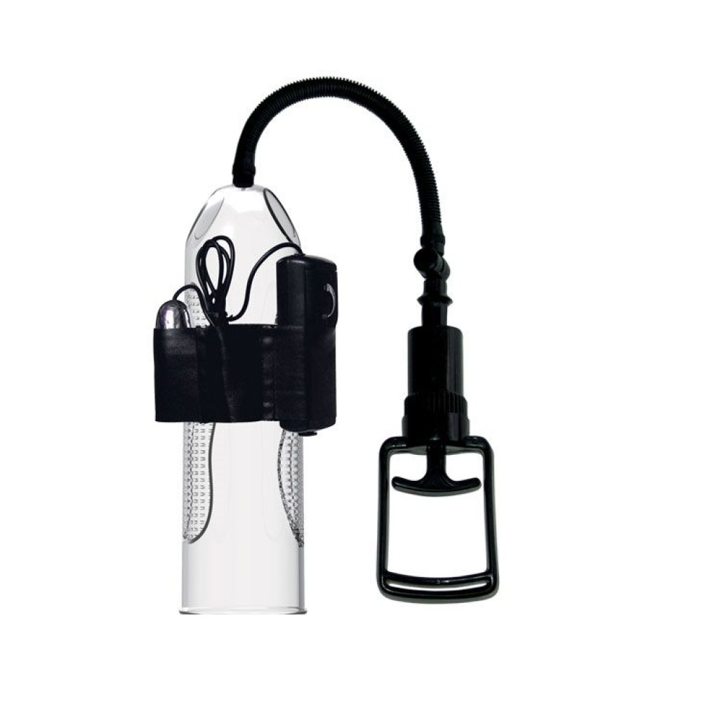 Вакуумная помпа с вибрацией, выполненная из прозрачного материала с уплотненной манжетой черного цвета, которая плотно обхватывает половой член, создавая полную герметичность. Воздух откачивается при помощи вакуумного шл...