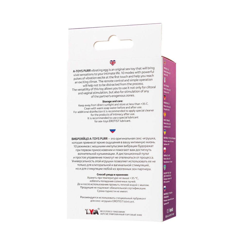 Виброяйцо A-Toys Purr – это оригинальная секс-игрушка, которая привнесет яркие ощущения в вашу интимную жизнь.10 режимов с мощными импульсами вибрации будоражат при первом прикосновении и помогают подвести партнера к вол...