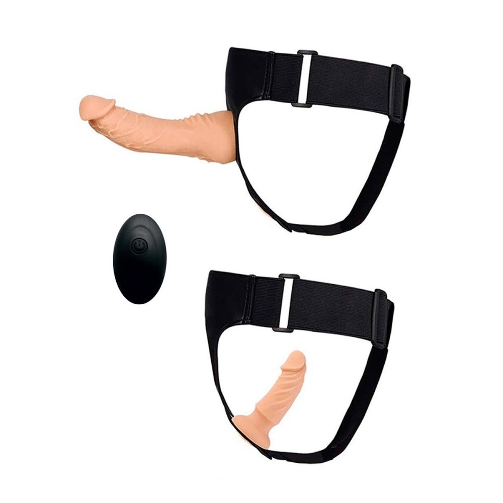 Оригинальная секс-игрушка подарит разнообразные эротические удовольствия обоим партнёрам. Режимы вибрации повысят уровень удовольствия и доведут до пика наслаждения. В комплект входят: два съёмных реалистичных вибратора, удобные трусики с эластичными ремнями, два съёмных коннектора, дистанционный пульт управления, USB-провод. Для использования в качестве страпона вибраторы накручиваются на вставленные в отверстия трусиков коннекторы. При этом удовольствие получают оба партнёра. Также вибромассажёры могут использоваться в качестве самостоятельных секс-игрушек для всех видов интимной близости. Вибратор большего размера гнётся в разные стороны. 10 режимов вибрации. Размер трусиков может регулироваться. Ремни хорошо тянутся, позволяя использовать изделие людям с разными параметрами тела. Длина большой насадки - 20 см, диаметр - 5 см. Длина малой насадки - 12,5 см, диаметр - 3,2 см.