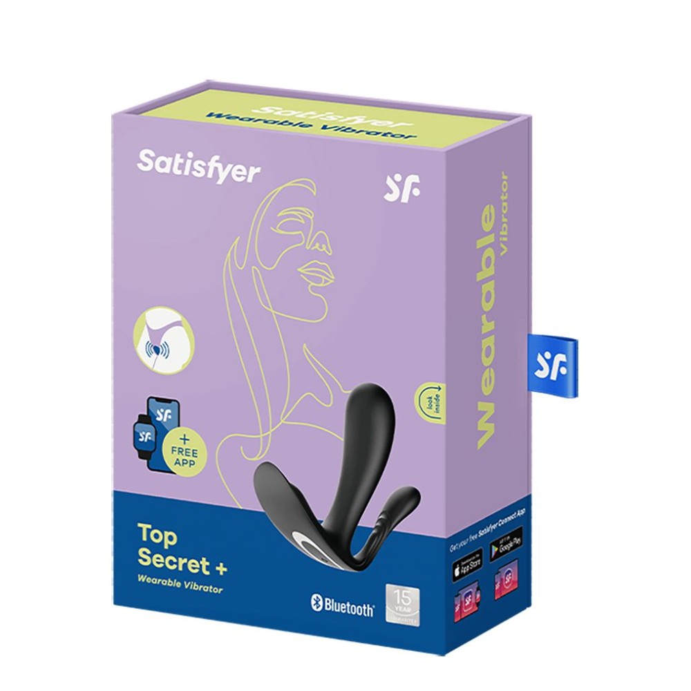 Носимый вибратор Top Secret+ имеет плоское эргономичное основание, обеспечивающее максимальный комфорт, а также ребристый стержень для клиторальной стимуляции. Этот вибратор, с бонусным стержнем для анальной стимуляции, эргономично изогнут, чтобы идеально воздействовать на точку G. Испытайте сильные вибрации благодаря каплевидной форме. Через Bluetooth Top Secret+ подключается к отмеченному наградами бесплатному приложению Satisfyer Connect, что предоставляет вам возможность независимо управлять двумя моторами и настраивать вакуум-волновое воздействие и вибрации на ходу. Top Secret+ изготовлен из безопасного для тела силикона, работает от аккумулятора и имеет степень водонепроницаемости IPX7. Диаметр отростков - 3 и 1,7 см.