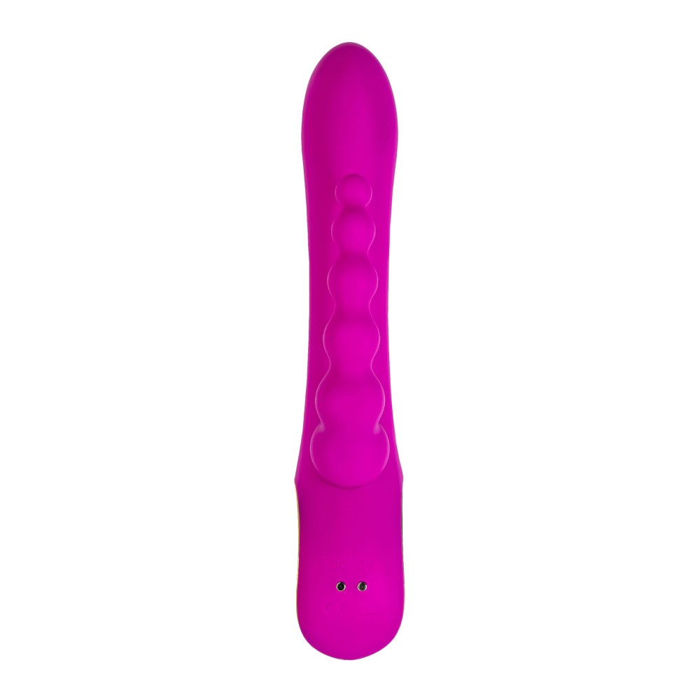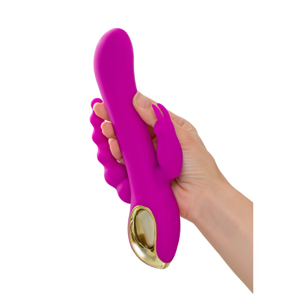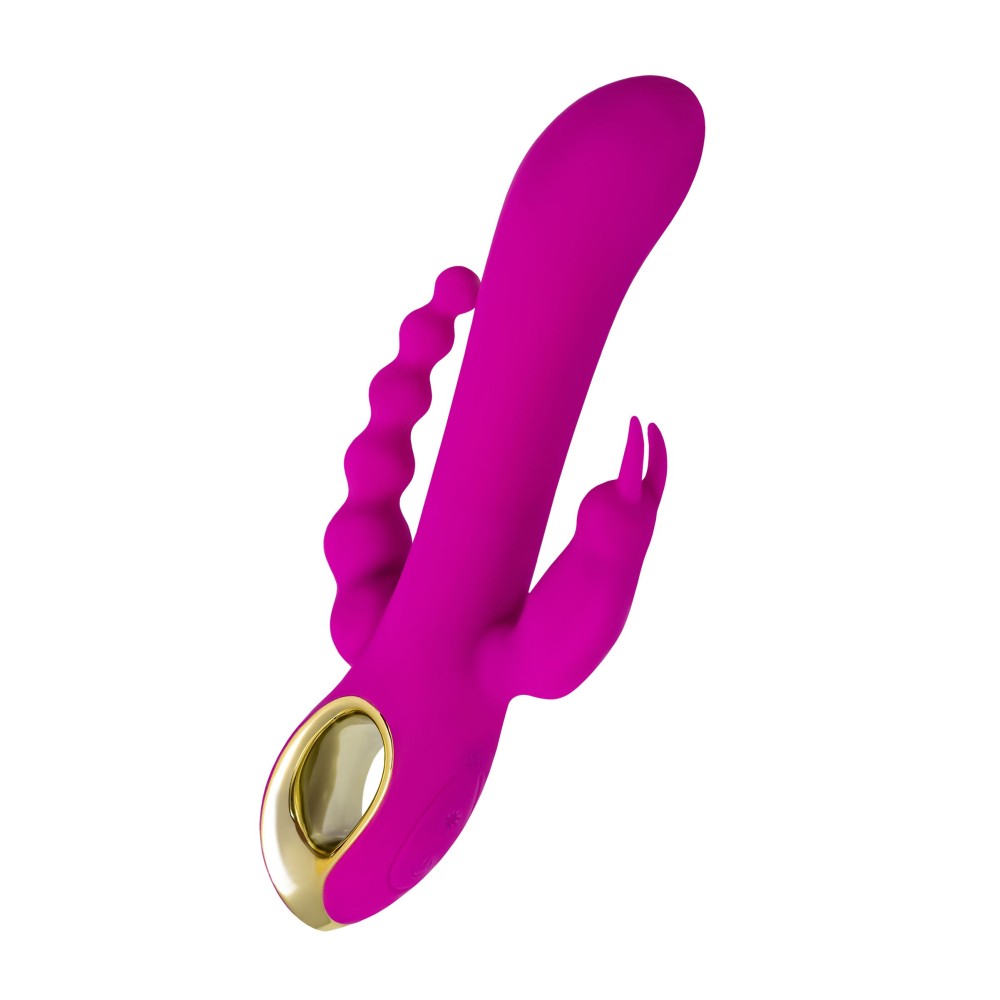 Тройной вибратор Trinny охватит сразу все возможные зоны удовольствия. Два мотора заставят трепетать все ваши внутренние эрогенные точки. Слегка загнутая головка найдет точку G, а анальный отросток очень легко ввести благодаря его постепенному расширению. Милые ушки кролика дополнят ощущения и приведут к неизбежному оргазму. Вибратор управляется тремя кнопками: нижняя - включение/выключение, средняя - переключение режимов в отростках, верхняя - в основном вибраторе. Рабочая длина - 13 см. Длина анального отростка - 11 см.