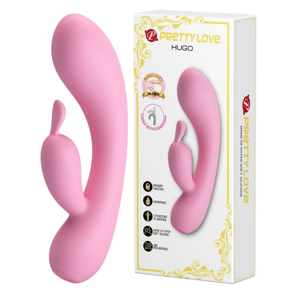 Нежно-розовый вибратор Hugo с клиторальным отростком - 16,5 см.